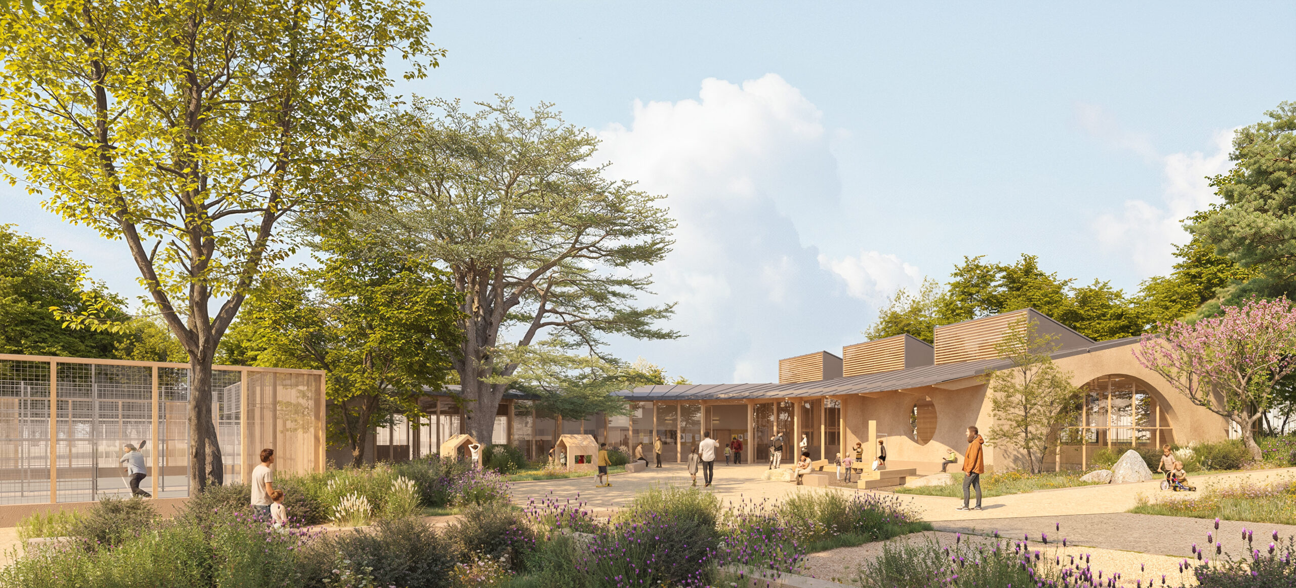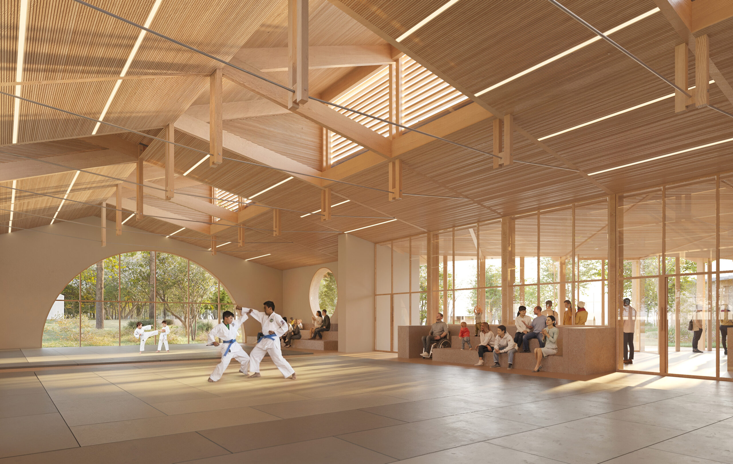 Son architecture organique s’organise autour de la conservation d’un cèdre remarquable, véritable cœur symbolique du projet, autour duquel s’enroulent le bâtiment et les aménagements extérieurs. L’ensemble développe une relation étroite entre architecture et paysage, renforcée par des cheminements piétons structurants, notamment une diagonale majeure pensée comme colonne vertébrale du site, assurant à la fois lisibilité, accessibilité et anticipation des évolutions futures du stade.