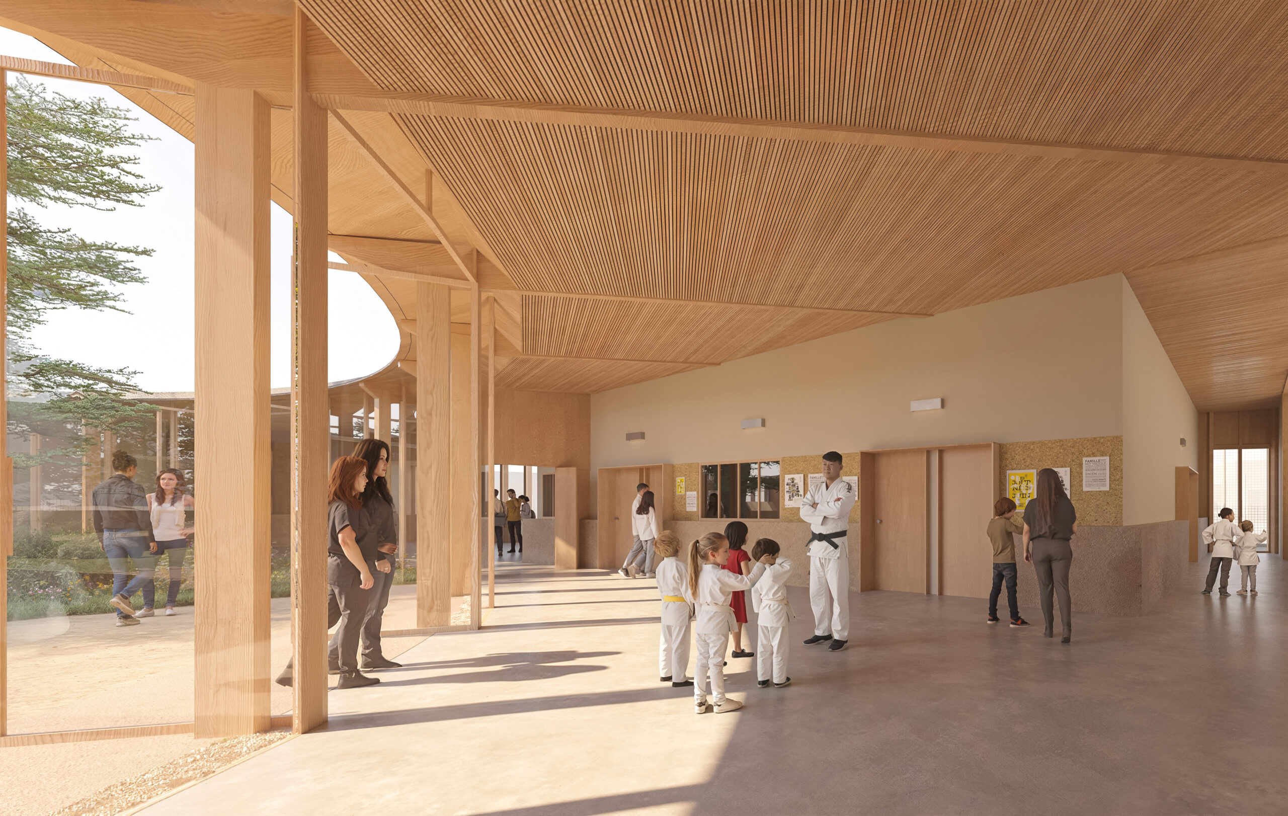 Le programme intérieur est clairement hiérarchisé entre espace de convivialité, pôle fonctionnel et salle multisports, tous largement ouverts sur le paysage. Les choix constructifs privilégient des matériaux bruts, durables et biosourcés – béton teinté, bois et zinc – conférant au projet une identité propre, pérenne et respectueuse des enjeux actuels.